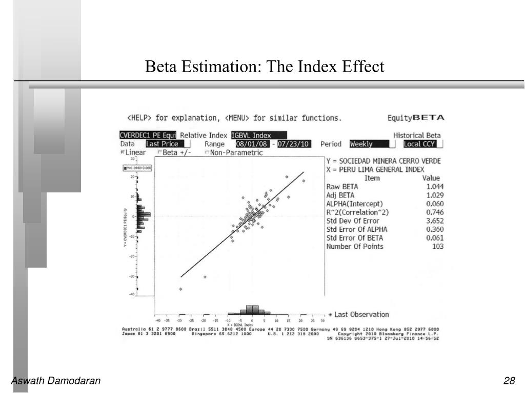 Why the CAPM persists… • The CAPM, notwithstanding its many critics and limitations, has survived as the default model for risk in equity valuation and corporate finance. The alternative models that have been presented as better models (APM, Multifactor model..) have made inroads in performance evaluation but not in prospective analysis because: • The alternative models (which are richer) do a much better job than the CAPM in explaining past return, but their effectiveness drops off when it comes to estimating expected future returns (because the models tend to shift and change). • The alternative models are more complicated and require more information than the CAPM. • For most companies, the expected returns you get with the the alternative models is not different enough to be worth the extra trouble of estimating four additional betas.