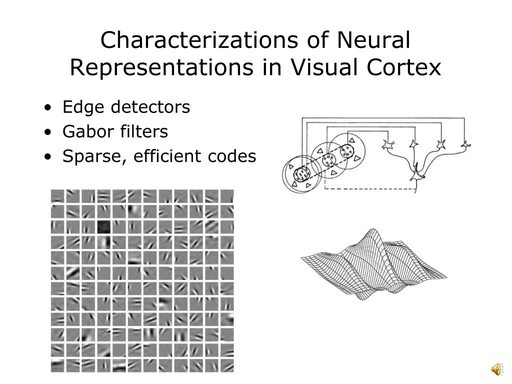 Characterizations of Neural Representations in Visual Cortex • Edge detectors • Gabor filters • Sparse, efficient codes