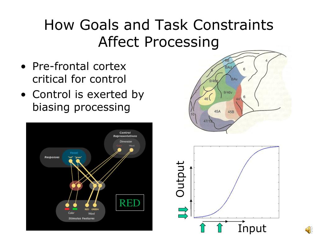 How Goals and Task Constraints Affect Processing • Pre-frontal cortex critical for control • Control is exerted by biasing processing Output RED Input