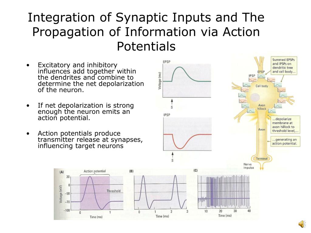 Integration of Synaptic Inputs and The Propagation of Information via Action Potentials • Excitatory and inhibitory influences add together within the dendrites and combine to determine the net depolarization of the neuron. • If net depolarization is strong enough the neuron emits an action potential. • Action potentials produce transmitter release at synapses, influencing target neurons