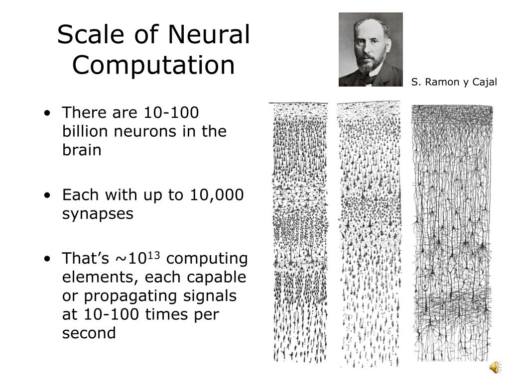 Scale of NeuralComputation S. Ramon y Cajal • There are 10-100 billion neurons in the brain • Each with up to 10,000 synapses • That’s ~1013computing elements, each capable or propagating signals at 10-100 times per second