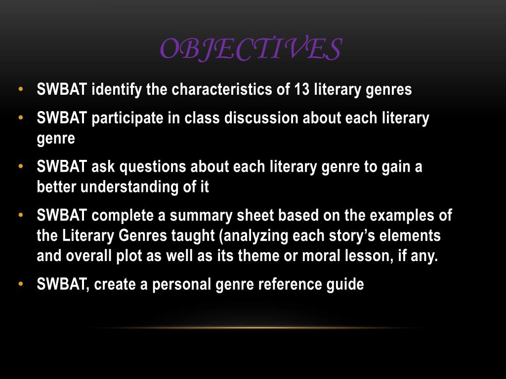 OBJECTIVES • SWBAT identify the characteristics of 13 literary genres • SWBAT participate in class discussion about each literary genre • SWBAT ask questions about each literary genre to gain a better understanding of it • SWBAT complete a summary sheet based on the examples of the Literary Genres taught (analyzing each story’s elements and overall plot as well as its theme or moral lesson, if any. • SWBAT, create a personal genre reference guide