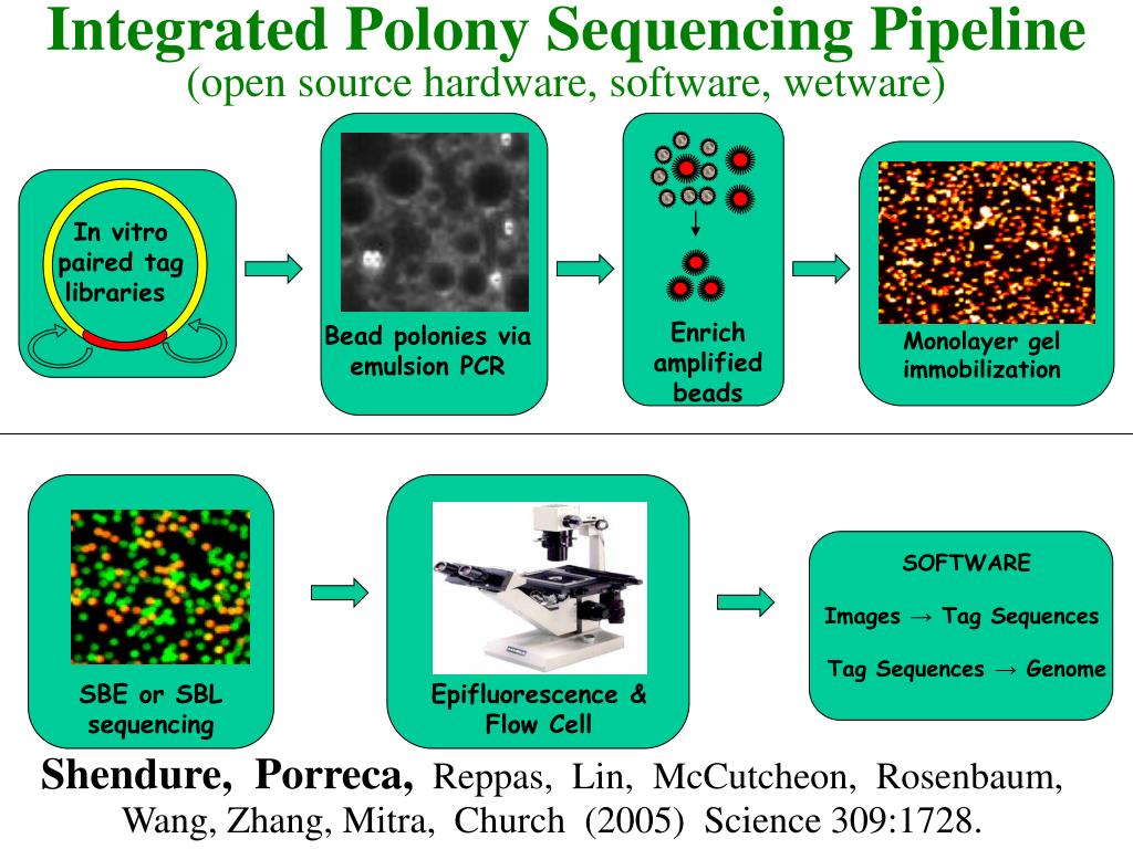 In vitro paired tag libraries Monolayer gel immobilization SOFTWARE Images → Tag Sequences Tag Sequences → Genome Integrated Polony Sequencing Pipeline(open source hardware, software, wetware) Enrich amplified beads Bead polonies via emulsion PCR SBE or SBL sequencing Epifluorescence & Flow Cell Shendure, Porreca, Reppas, Lin, McCutcheon, Rosenbaum, Wang, Zhang, Mitra, Church (2005) Science 309:1728.