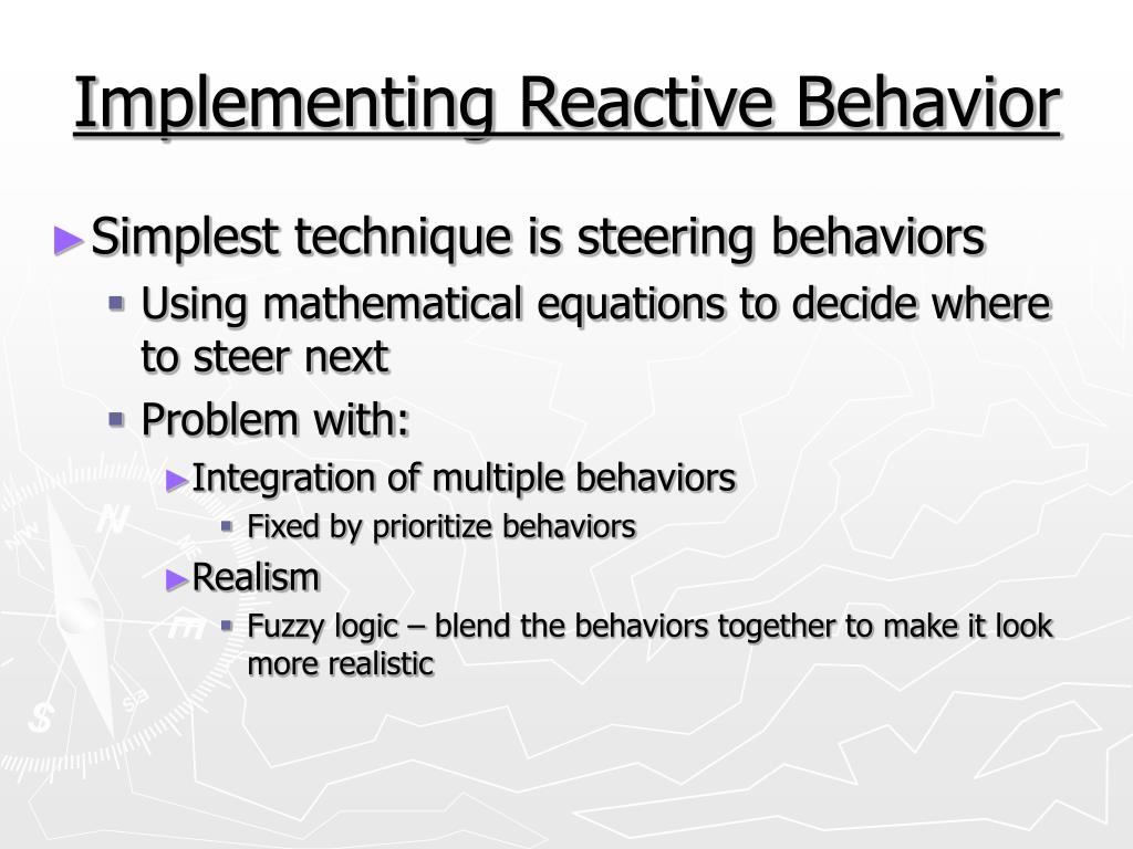 Implementing Reactive Behavior • Simplest technique is steering behaviors • Using mathematical equations to decide where to steer next • Problem with: • Integration of multiple behaviors • Fixed by prioritize behaviors • Realism • Fuzzy logic – blend the behaviors together to make it look more realistic