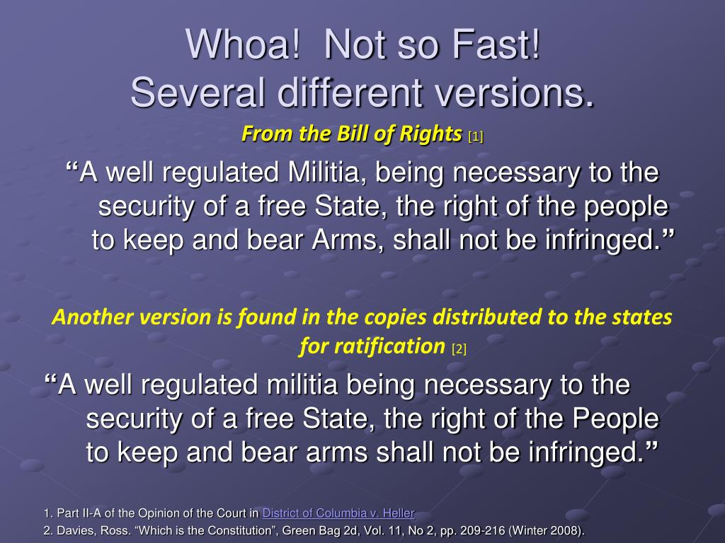 Whoa! Not so Fast! Several different versions. From the Bill of Rights [1] “A well regulated Militia, being necessary to the security of a free State, the right of the people to keep and bear Arms, shall not be infringed.” Another version is found in the copies distributed to the states for ratification [2] “A well regulated militia being necessary to the security of a free State, the right of the People to keep and bear arms shall not be infringed.” 1. Part II-A of the Opinion of the Court in District of Columbia v. Heller 2. Davies, Ross. “Which is the Constitution”, Green Bag 2d, Vol. 11, No 2, pp. 209-216 (Winter 2008).