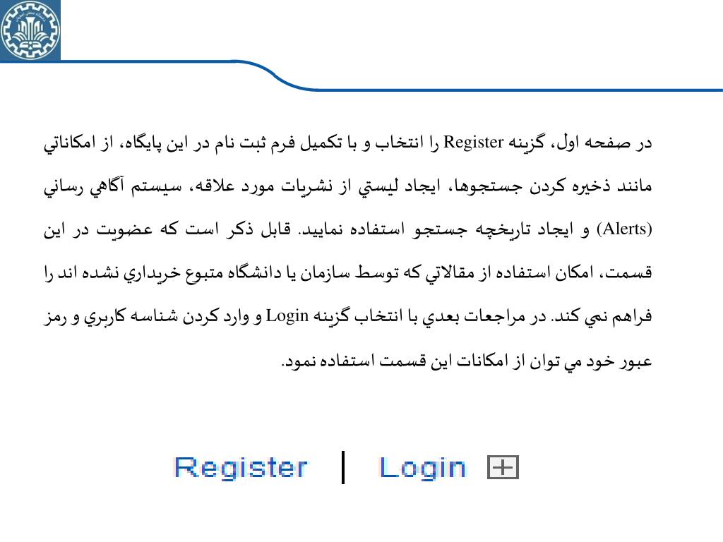 در صفحه اول، گزينه Register را انتخاب و با تكميل فرم ثبت نام در اين پايگاه، از امکاناتي مانند ذخيره کردن جستجوها، ايجاد ليستي از نشريات مورد علاقه، سيستم آگاهي رساني (Alerts) و ايجاد تاريخچه جستجو استفاده نماييد. قابل ذكر است كه عضويت در اين قسمت، امكان استفاده از مقالاتي كه توسط سازمان يا دانشگاه متبوع خريداري نشده اند را فراهم نمي كند. در مراجعات بعدي با انتخاب گزينه Login و وارد كردن شناسه كاربري و رمز عبور خود مي توان از امكانات اين قسمت استفاده نمود.