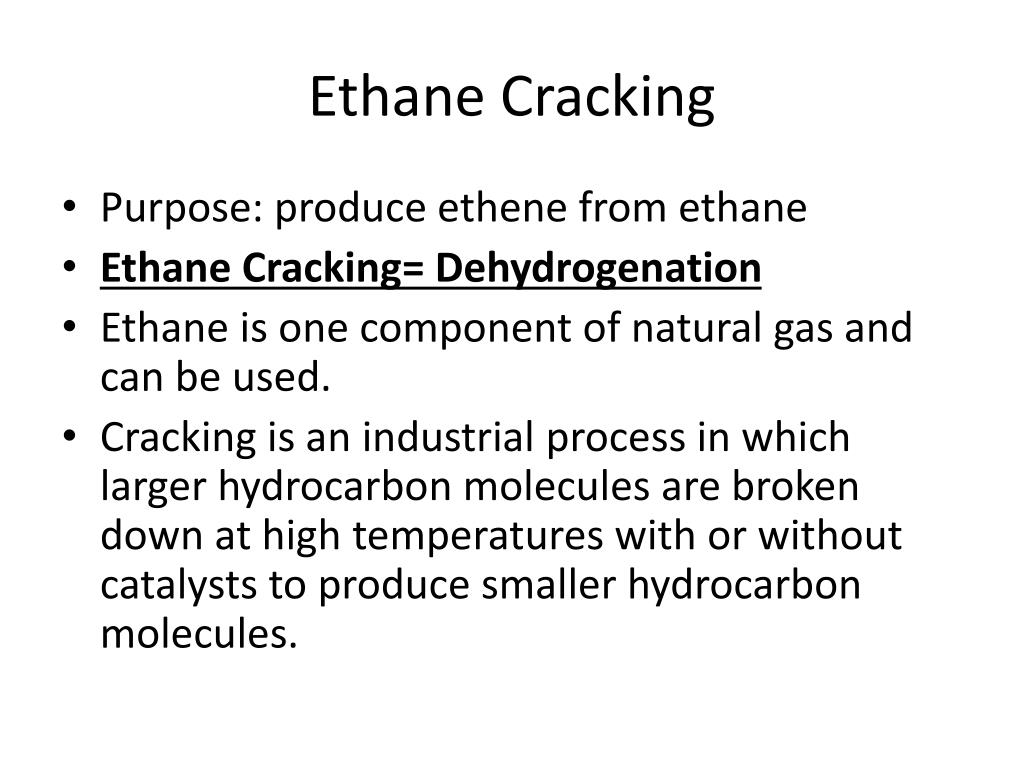 Ethane Cracking • Purpose: produce ethene from ethane • Ethane Cracking= Dehydrogenation • Ethane is one component of natural gas and can be used. • Cracking is an industrial process in which larger hydrocarbon molecules are broken down at high temperatures with or without catalysts to produce smaller hydrocarbon molecules.