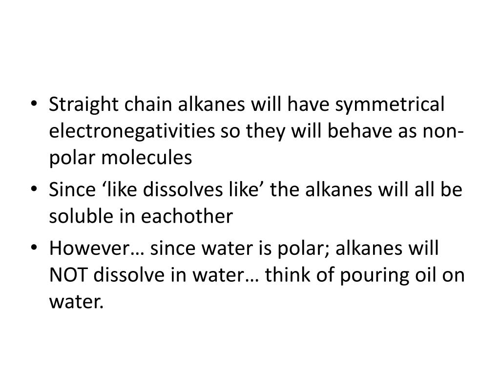 Straight chain alkanes will have symmetrical electronegativities so they will behave as non-polar molecules • Since ‘like dissolves like’ the alkanes will all be soluble in eachother • However… since water is polar; alkanes will NOT dissolve in water… think of pouring oil on water.