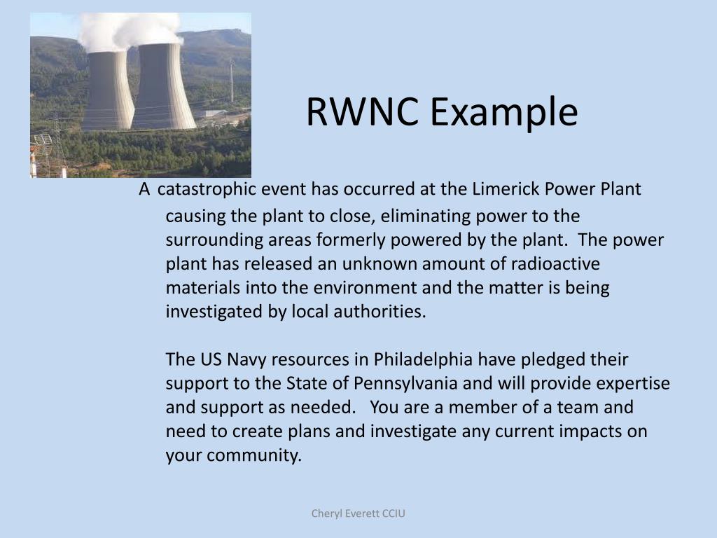RWNC Example Acatastrophic event has occurred at the Limerick Power Plant causing the plant to close, eliminating power to the surrounding areas formerly powered by the plant. The power plant has released an unknown amount of radioactive materials into the environment and the matter is being investigated by local authorities.The US Navy resources in Philadelphia have pledged their support to the State of Pennsylvania and will provide expertise and support as needed. You are a member of a team and need to create plans and investigate any current impacts on your community. Cheryl Everett CCIU