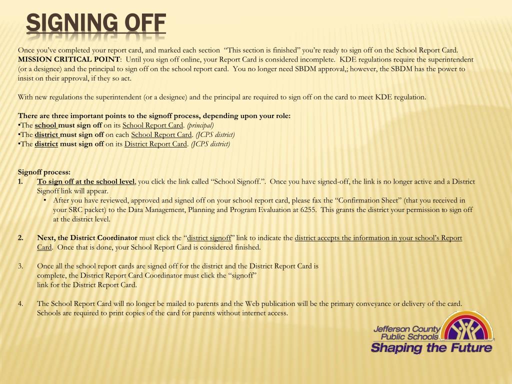 Signing off • Once you’ve completed your report card, and marked each section “This section is finished” you’re ready to sign off on the School Report Card. • MISSION CRITICAL POINT: Until you sign off online, your Report Card is considered incomplete. KDE regulations require the superintendent (or a designee) and the principal to sign off on the school report card. You no longer need SBDM approval,; however, the SBDM has the power to insist on their approval, if they so act. • With new regulations the superintendent (or a designee) and the principal are required to sign off on the card to meet KDE regulation. • There are three important points to the signoff process, depending upon your role: • The school must sign off on its School Report Card. (principal) • The district must sign off on each School Report Card. (JCPS district) • The district must sign off on its District Report Card. (JCPS district) • Signoff process: • To sign off at the school level, you click the link called “School Signoff.”. Once you have signed-off, the link is no longer active and a District Signoff link will appear. • After you have reviewed, approved and signed off on your school report card, please fax the “Confirmation Sheet” (that you received in your SRC packet) to the Data Management, Planning and Program Evaluation at 6255. This grants the district your permission to sign off at the district level. • Next, the District Coordinator must click the “district signoff” link to indicate the district accepts the information in your school’s Report Card. Once that is done, your School Report Card is considered finished. • Once all the school report cards are signed off for the district and the District Report Card is • complete, the District Report Card Coordinator must click the “signoff” • link for the District Report Card. • The School Report Card will no longer be mailed to parents and the Web publication will be the primary conveyance or delivery of the card. Schools are required to print copies of the card for parents without internet access.