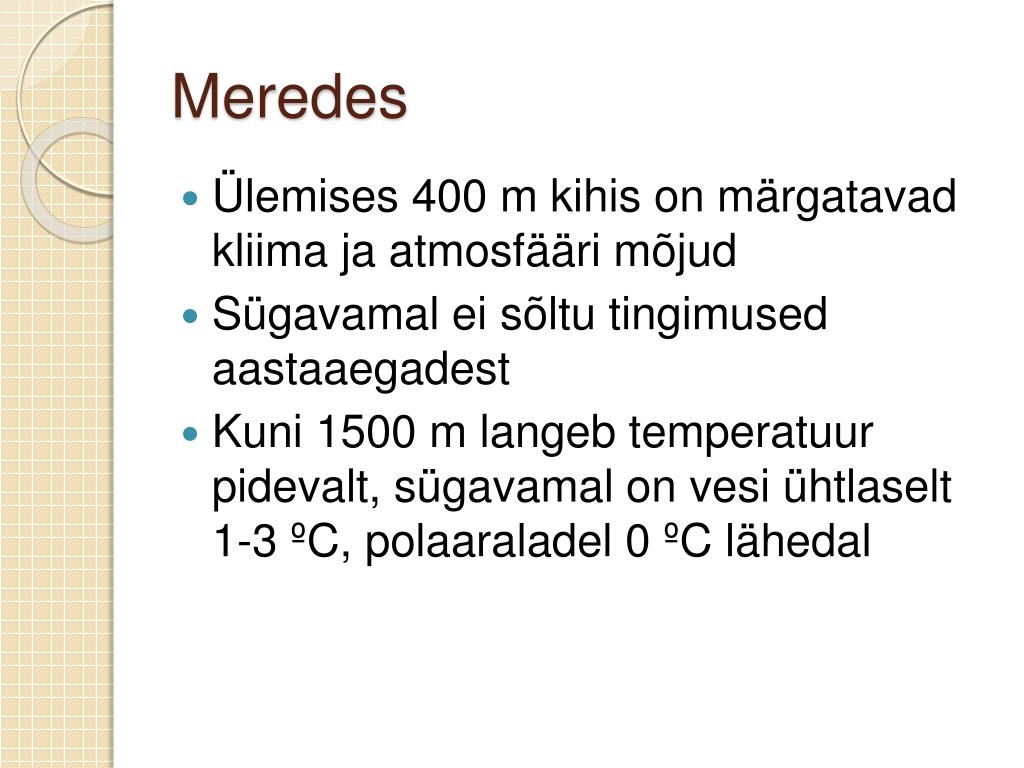 Meredes • Ülemises 400 m kihis on märgatavad kliima ja atmosfääri mõjud • Sügavamal ei sõltu tingimused aastaaegadest • Kuni 1500 m langeb temperatuur pidevalt, sügavamal on vesi ühtlaselt 1-3 ºC, polaaraladel 0 ºC lähedal