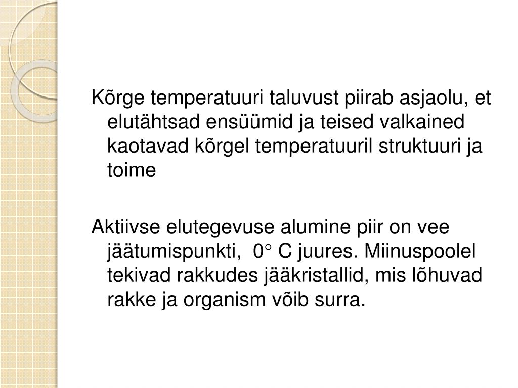 TEMPERATUUR • Enamiku organismide temperatuuri taluvusala jääb 0° C ja +50° C vahele. • Madalat ja liiga kõrget t° taluvad puhkeseisundis eosed ja seemned. • Mõned samblikud ja samblad taluvad -70° C • Kuumataluvad on sinivetikad ja bakterid • Hulkrakseid loomi või taimi pole looduses leitud vees mille t° ületab +50° C