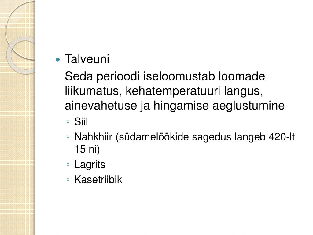 Talveuni Seda perioodi iseloomustab loomade liikumatus, kehatemperatuuri langus, ainevahetuse ja hingamise aeglustumine • Siil • Nahkhiir (südamelöökide sagedus langeb 420-lt 15 ni) • Lagrits • Kasetriibik