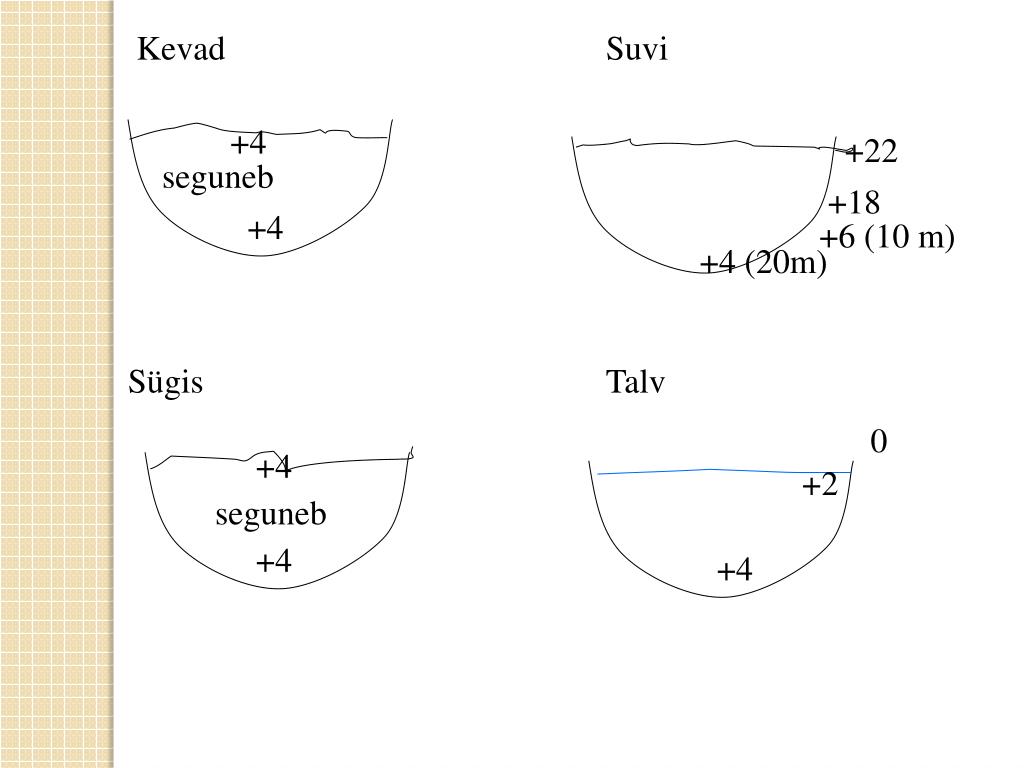 Kevad Suvi +4 +22 seguneb +18 +4 +6 (10 m) +4 (20m) Sügis Talv 0 +4 +2 seguneb +4 +4