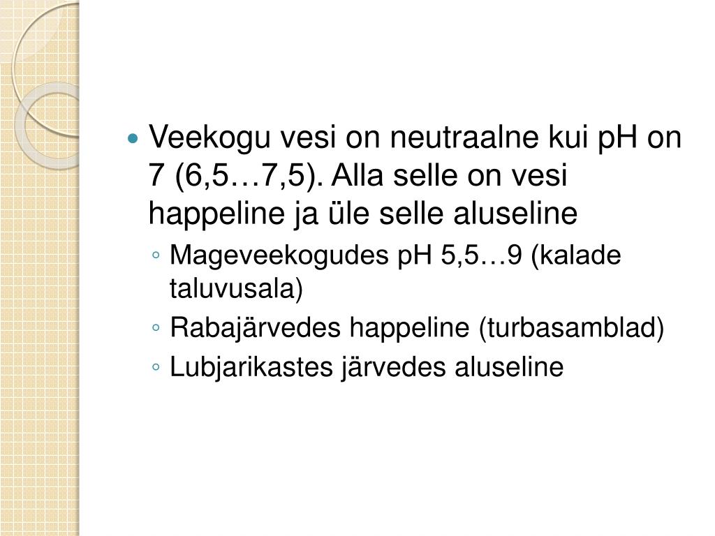 Veekogu vesi on neutraalne kui pH on 7 (6,5…7,5). Alla selle on vesi happeline ja üle selle aluseline • Mageveekogudes pH 5,5…9 (kalade taluvusala) • Rabajärvedes happeline (turbasamblad) • Lubjarikastes järvedes aluseline