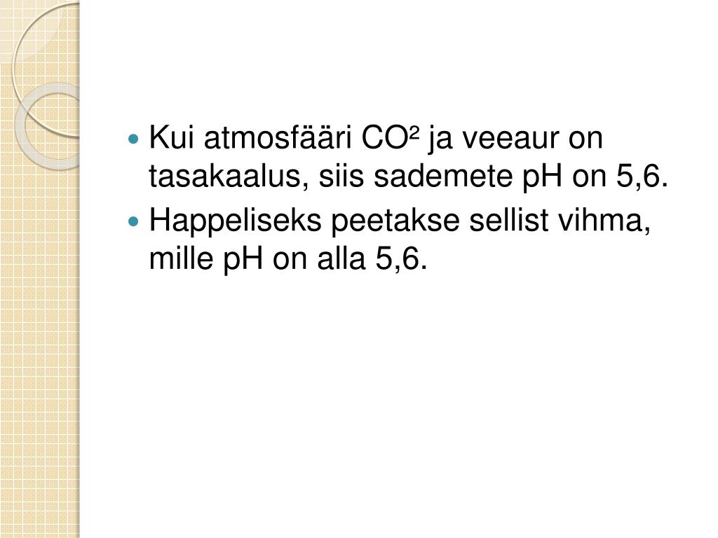 Kui atmosfääri CO² ja veeaur on tasakaalus, siis sademete pH on 5,6. • Happeliseks peetakse sellist vihma, mille pH on alla 5,6.