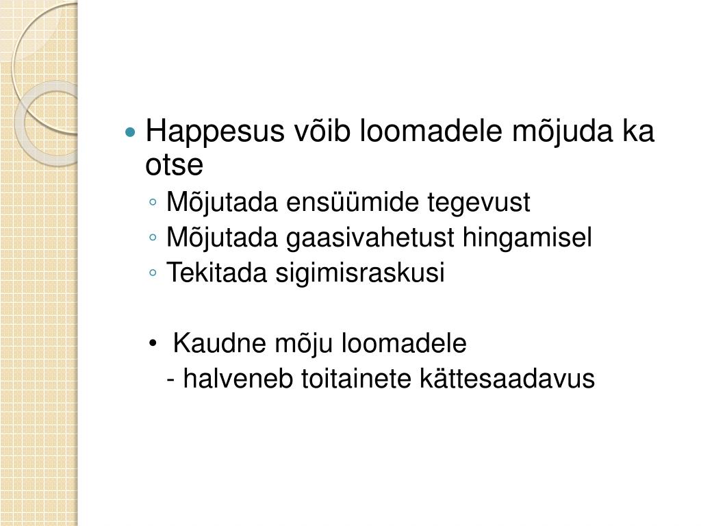 Happesus võib loomadele mõjuda ka otse • Mõjutada ensüümide tegevust • Mõjutada gaasivahetust hingamisel • Tekitada sigimisraskusi • Kaudne mõju loomadele - halveneb toitainete kättesaadavus