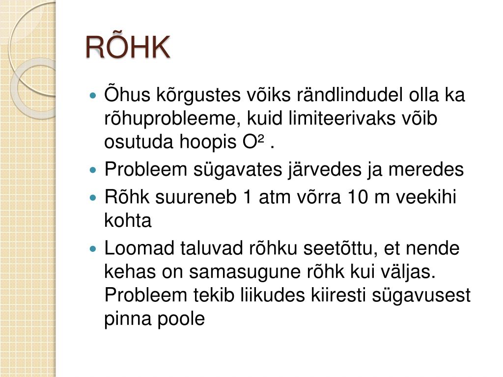 RÕHK • Õhus kõrgustes võiks rändlindudel olla ka rõhuprobleeme, kuid limiteerivaks võib osutuda hoopis O² . • Probleem sügavates järvedes ja meredes • Rõhk suureneb 1 atm võrra 10 m veekihi kohta • Loomad taluvad rõhku seetõttu, et nende kehas on samasugune rõhk kui väljas. Probleem tekib liikudes kiiresti sügavusest pinna poole