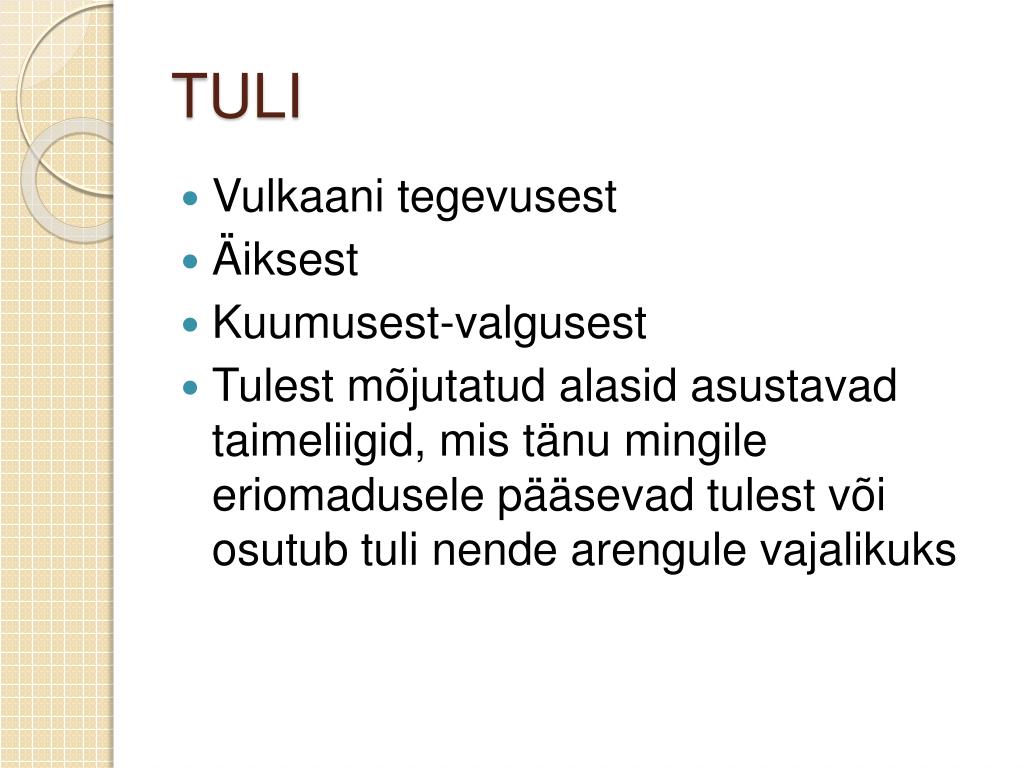 TULI • Vulkaani tegevusest • Äiksest • Kuumusest-valgusest • Tulest mõjutatud alasid asustavad taimeliigid, mis tänu mingile eriomadusele pääsevad tulest või osutub tuli nende arengule vajalikuks