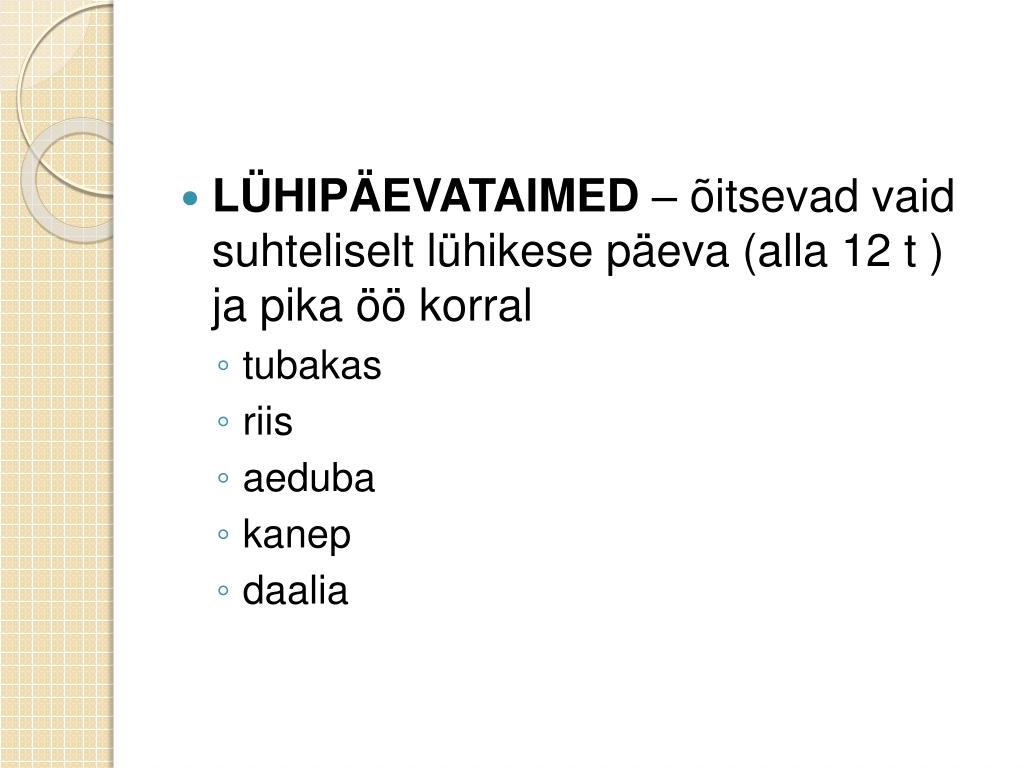 LÜHIPÄEVATAIMED – õitsevad vaid suhteliselt lühikese päeva (alla 12 t ) ja pika öö korral • tubakas • riis • aeduba • kanep • daalia