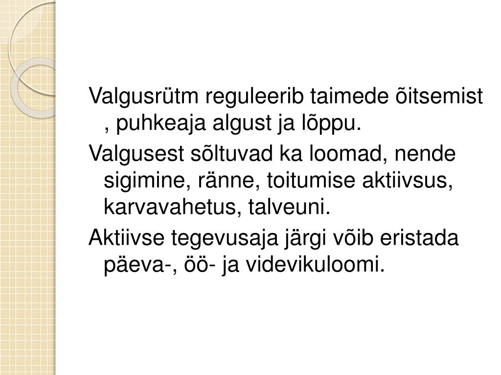 Valgusrütm reguleerib taimede õitsemist , puhkeaja algust ja lõppu. Valgusest sõltuvad ka loomad, nende sigimine, ränne, toitumise aktiivsus, karvavahetus, talveuni. Aktiivse tegevusaja järgi võib eristada päeva-, öö- ja videvikuloomi.