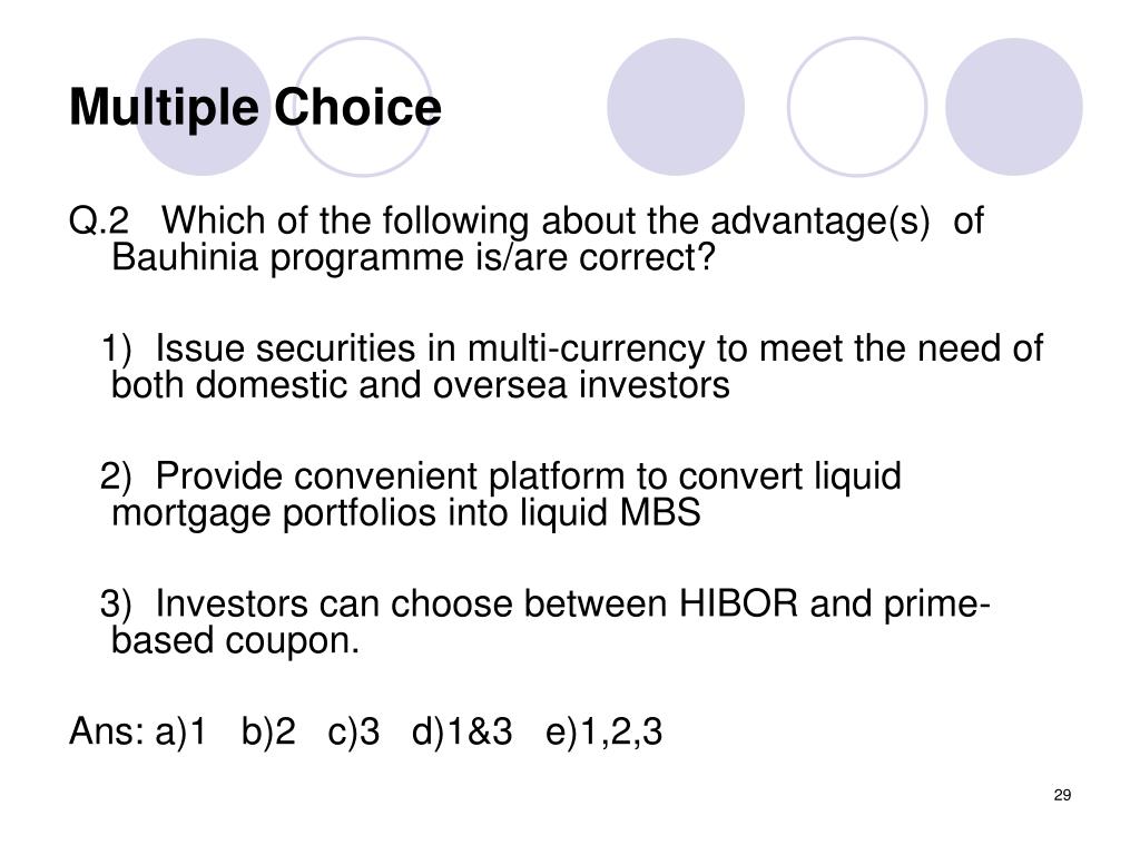 Multiple Choice Q.2 Which of the following about the advantage(s) of Bauhinia programme is/are correct? 1) Issue securities in multi-currency to meet the need of both domestic and oversea investors 2) Provide convenient platform to convert liquid mortgage portfolios into liquid MBS 3) Investors can choose between HIBOR and prime-based coupon. Ans: a)1 b)2 c)3 d)1&3 e)1,2,3
