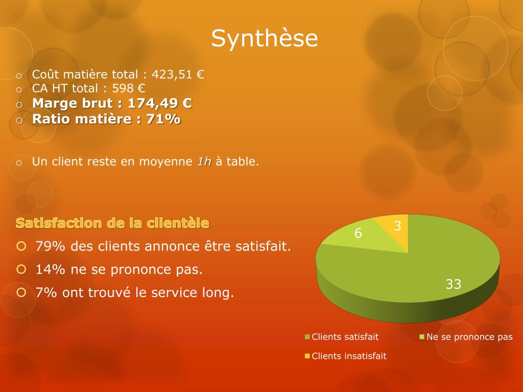 Synthèse • Coût matière total : 423,51 € • CA HT total : 598 € • Marge brut : 174,49 € • Ratio matière : 71% • Un client reste en moyenne 1h à table. Satisfaction de la clientèle • 79% des clients annonce être satisfait. • 14% ne se prononce pas. • 7% ont trouvé le service long.