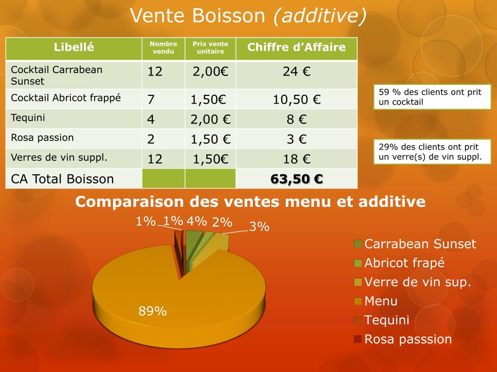 Vente Boisson (additive) 59 % des clients ont prit un cocktail 29% des clients ont prit un verre(s) de vin suppl.