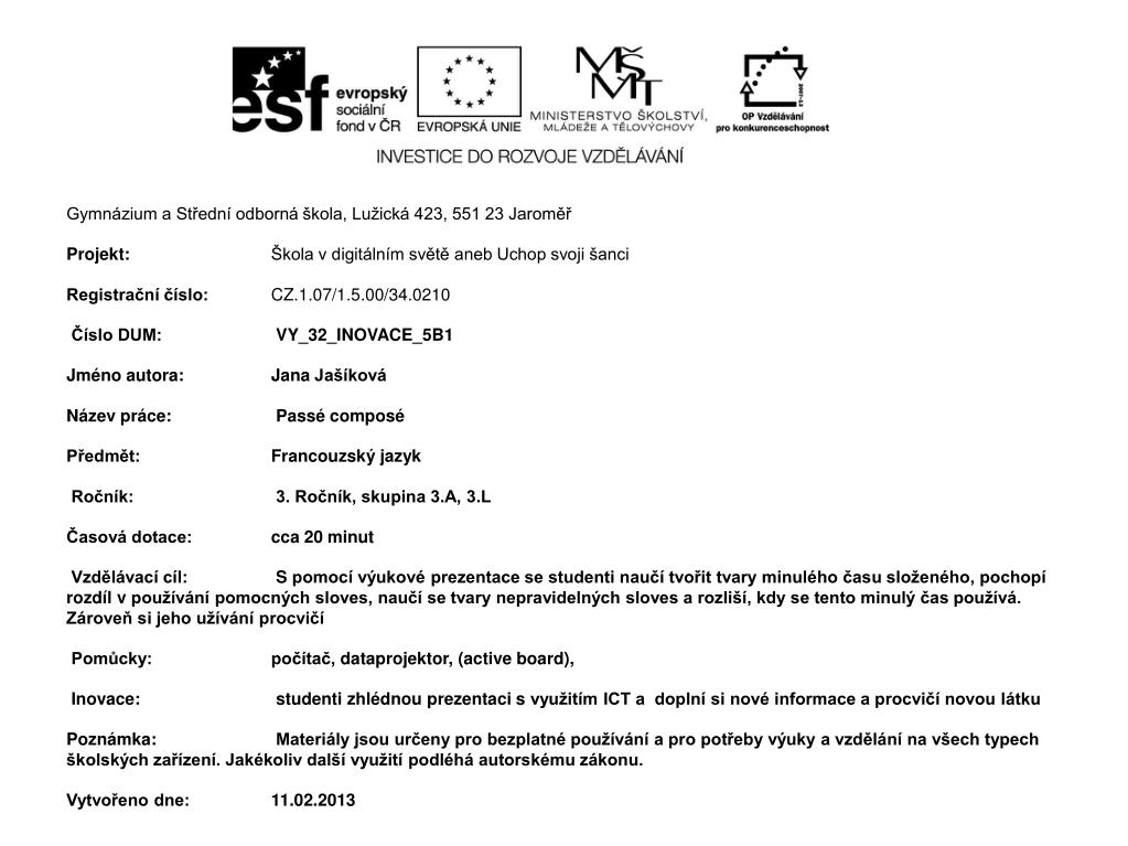 Gymnázium a Střední odborná škola, Lužická 423, 551 23 Jaroměř Projekt: Škola v digitálním světě aneb Uchop svoji šanci Registrační číslo: CZ.1.07/1.5.00/34.0210 • Číslo DUM: VY_32_INOVACE_5B1 Jméno autora: Jana Jašíková • Název práce: Passé composé Předmět: Francouzský jazyk • Ročník: 3. Ročník, skupina 3.A, 3.L Časová dotace: cca 20 minut • Vzdělávací cíl: S pomocí výukové prezentace se studenti naučí tvořit tvary minulého času složeného, pochopí rozdíl v používání pomocných sloves, naučí se tvary nepravidelných sloves a rozliší, kdy se tento minulý čas používá. Zároveň si jeho užívání procvičí Pomůcky: počítač, dataprojektor, (activeboard), • Inovace: studenti zhlédnou prezentaci s využitím ICT a doplní si nové informace a procvičí novou látku • Poznámka: Materiály jsou určeny pro bezplatné používání a pro potřeby výuky a vzdělání na všech typech školských zařízení. Jakékoliv další využití podléhá autorskému zákonu. Vytvořeno dne: 11.02.2013