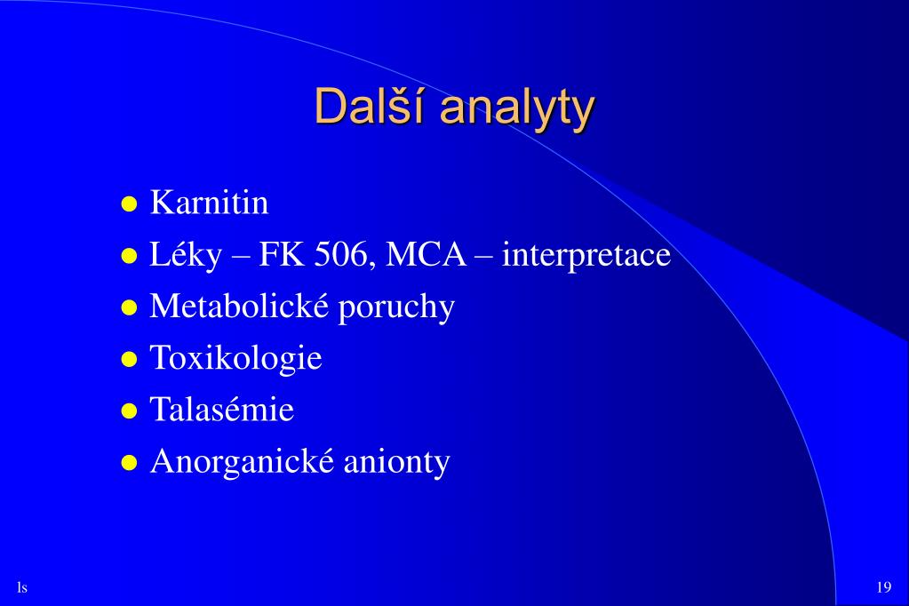 Další analyty • Karnitin • Léky – FK 506, MCA – interpretace • Metabolické poruchy • Toxikologie • Talasémie • Anorganické anionty