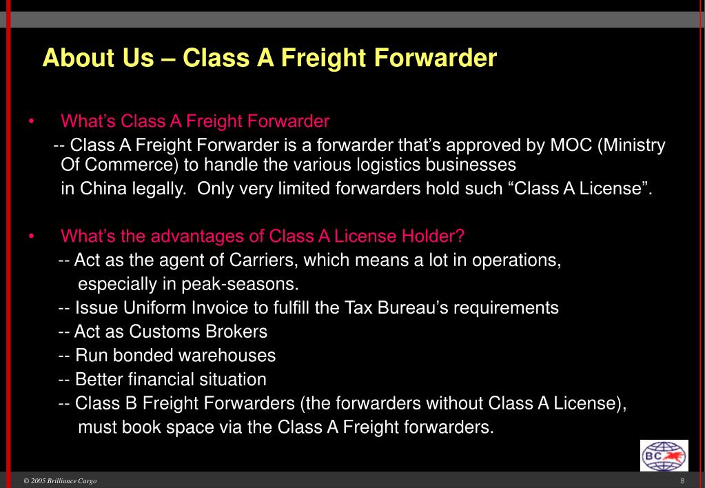 About Us – Class A Freight Forwarder • What’s Class A Freight Forwarder -- Class A Freight Forwarder is a forwarder that’s approved by MOC (Ministry Of Commerce) to handle the various logistics businesses in China legally. Only very limited forwarders hold such “Class A License”. • What’s the advantages of Class A License Holder? -- Act as the agent of Carriers, which means a lot in operations, especially in peak-seasons. -- Issue Uniform Invoice to fulfill the Tax Bureau’s requirements -- Act as Customs Brokers -- Run bonded warehouses -- Better financial situation -- Class B Freight Forwarders (the forwarders without Class A License), must book space via the Class A Freight forwarders.