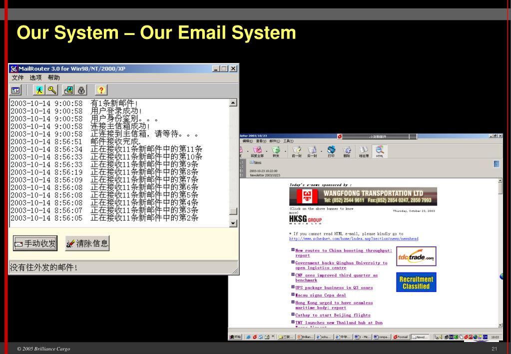 Our System – Integrated IT System • Integrated daily operations system, web system, • email system, fax system & bar-coding system. • Support local operations as well as international • operations • Support English as well as Chinese. • Support Internet tracking, tracing & reporting • Support EDI • Strong management tools • Efficiency, cost effective and friendly interface