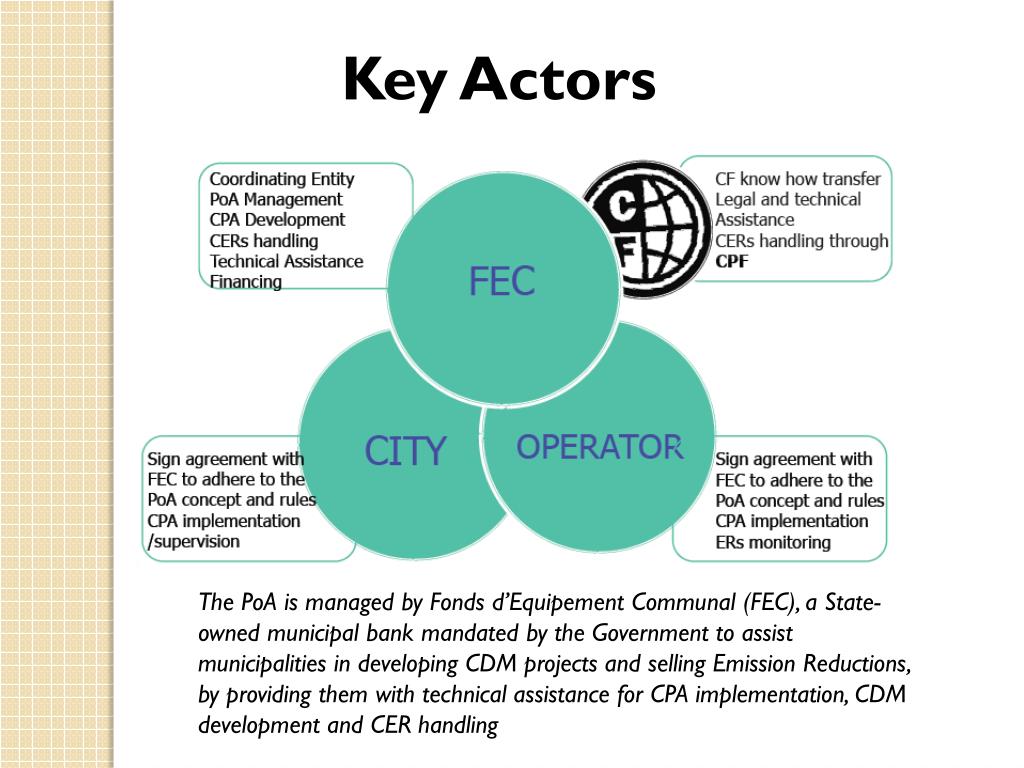 Key Actors The PoA is managed by Fonds d’Equipement Communal (FEC), a State-owned municipal bank mandated by the Government to assist municipalities in developing CDM projects and selling Emission Reductions, by providing them with technical assistance for CPA implementation, CDM development and CER handling