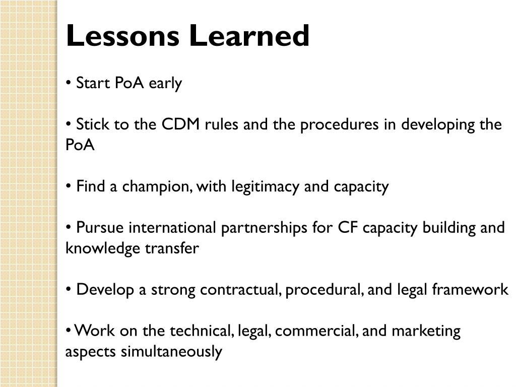 Lessons Learned • Start PoA early • Stick to the CDM rules and the procedures in developing the PoA • Find a champion, with legitimacy and capacity • Pursue international partnerships for CF capacity building and knowledge transfer • Develop a strong contractual, procedural, and legal framework • Work on the technical, legal, commercial, and marketing aspects simultaneously