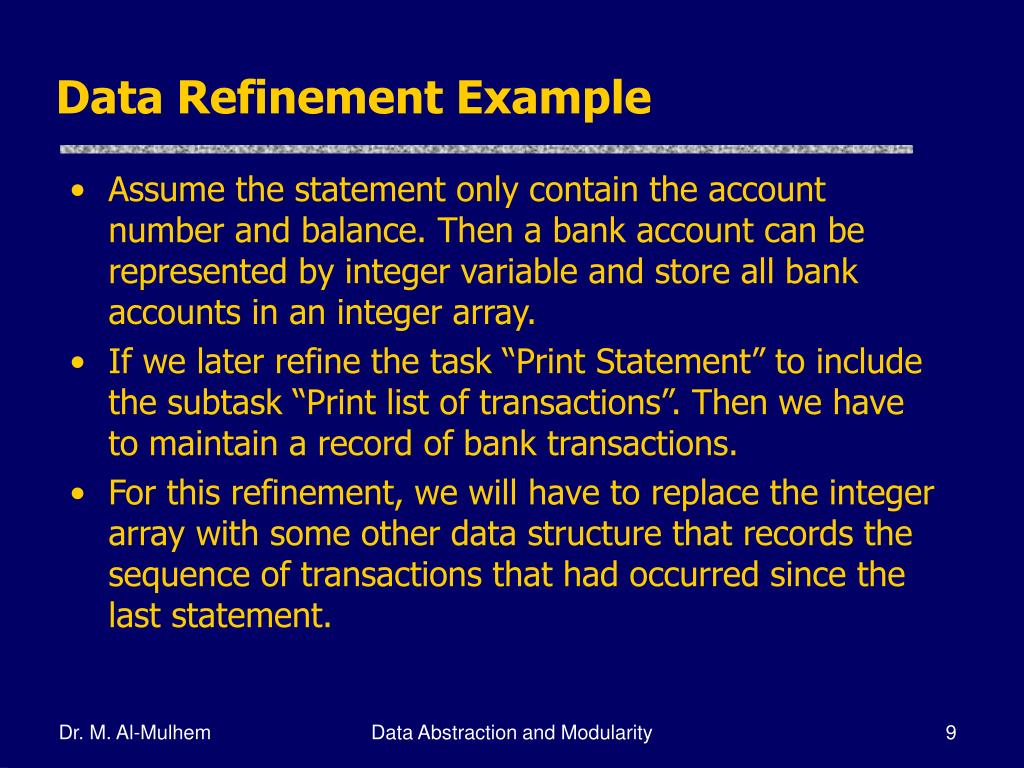 Data Refinement Example • Consider the problem of designing a simple banking program. It process accounts and print monthly bank statements Bank Transactions Deposit Withdraw Print Statement Print transaction history Data Abstraction and Modularity
