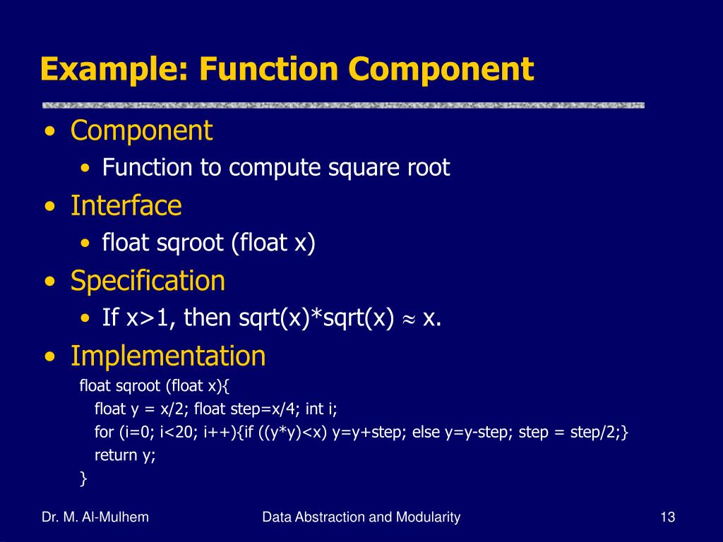 Example: Function Component • Component • Function to compute square root • Interface • float sqroot (float x) • Specification • If x>1, then sqrt(x)*sqrt(x) x. • Implementation float sqroot (float x){ float y = x/2; float step=x/4; int i; for (i=0; i<20; i++){if ((y*y)<x) y=y+step; else y=y-step; step = step/2;} return y; } Data Abstraction and Modularity