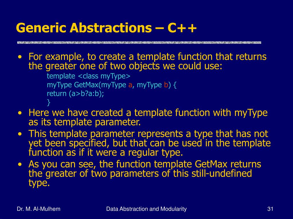 Generic Abstractions – C++ • To use this function template we use the following format for the function call: function_name <type> (parameters); • For example, to call GetMax to compare two integer values of type int we can write: int x,y; GetMax <int> (x,y); Data Abstraction and Modularity