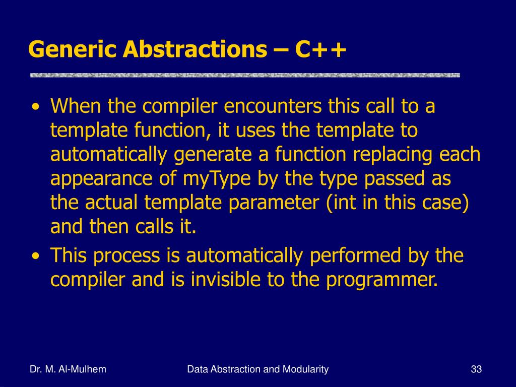 Generic Abstractions – C++ • When the compiler encounters this call to a template function, it uses the template to automatically generate a function replacing each appearance of myType by the type passed as the actual template parameter (int in this case) and then calls it. • This process is automatically performed by the compiler and is invisible to the programmer. Data Abstraction and Modularity