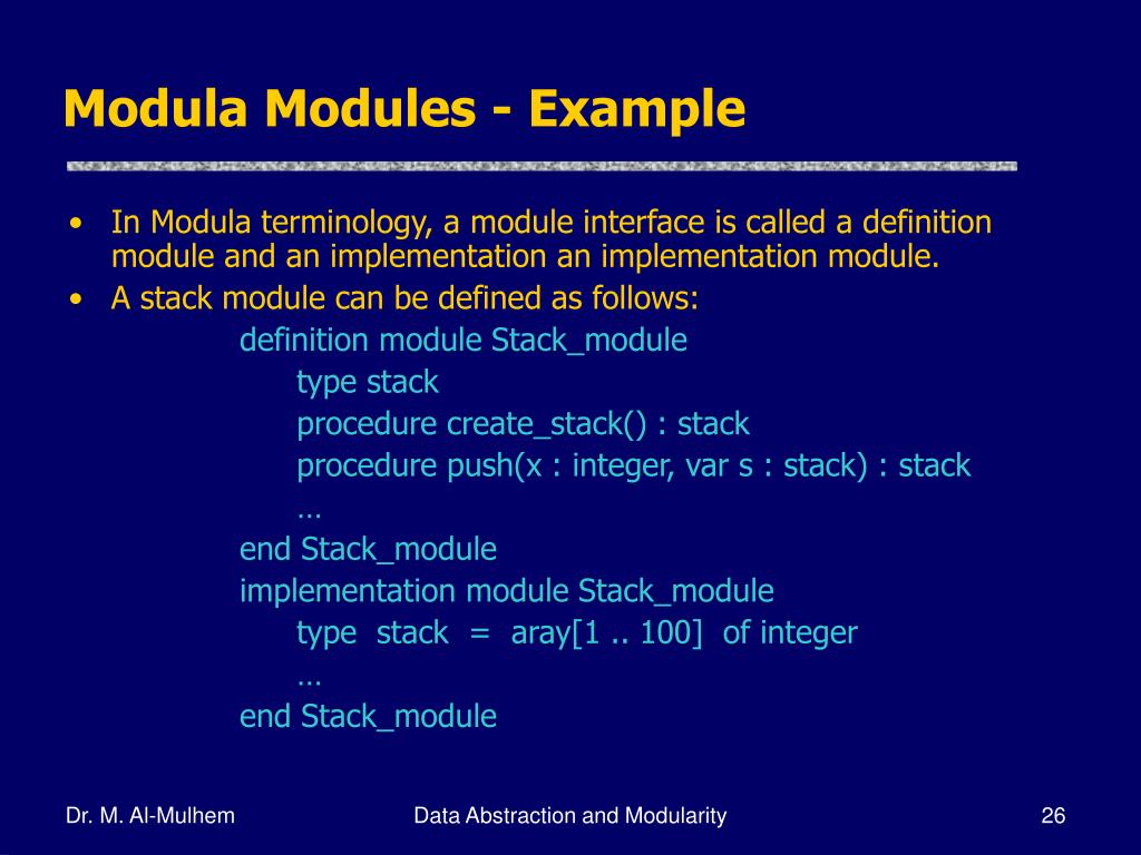 Modula Modules - Example • In Modula terminology, a module interface is called a definition module and an implementation an implementation module. • A stack module can be defined as follows: definition module Stack_module type stack procedure create_stack() : stack procedure push(x : integer, var s : stack) : stack … end Stack_module implementation module Stack_module type stack = aray[1 .. 100] of integer … end Stack_module Data Abstraction and Modularity
