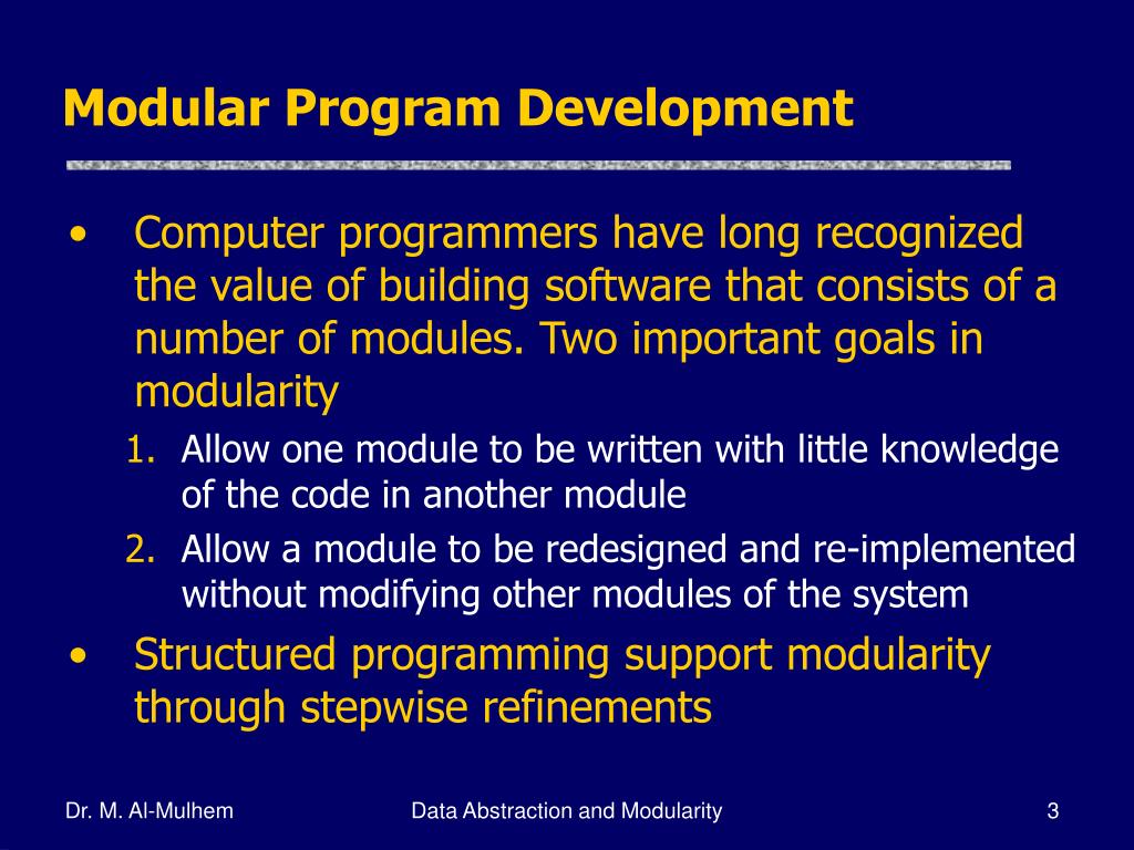 Modular Program Development • Computer programmers have long recognized the value of building software that consists of a number of modules. Two important goals in modularity • Allow one module to be written with little knowledge of the code in another module • Allow a module to be redesigned and re-implemented without modifying other modules of the system • Structured programming support modularity through stepwise refinements Data Abstraction and Modularity