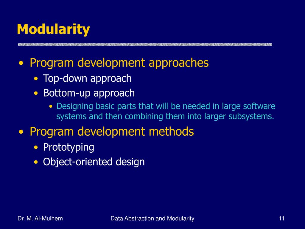 Modularity • Program development approaches • Top-down approach • Bottom-up approach • Designing basic parts that will be needed in large software systems and then combining them into larger subsystems. • Program development methods • Prototyping • Object-oriented design Data Abstraction and Modularity