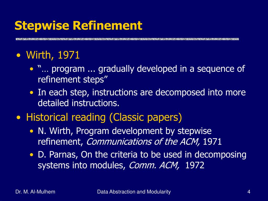Stepwise Refinement • Wirth, 1971 • “… program ... gradually developed in a sequence of refinement steps” • In each step, instructions are decomposed into more detailed instructions. • Historical reading (Classic papers) • N. Wirth, Program development by stepwise refinement, Communications of the ACM, 1971 • D. Parnas, On the criteria to be used in decomposing systems into modules, Comm. ACM, 1972 Data Abstraction and Modularity