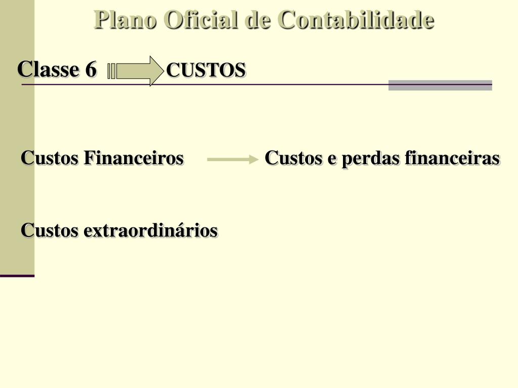 Plano Oficial de Contabilidade Classe 6CUSTOS Custos Financeiros Custos e perdas financeiras Custos extraordinários