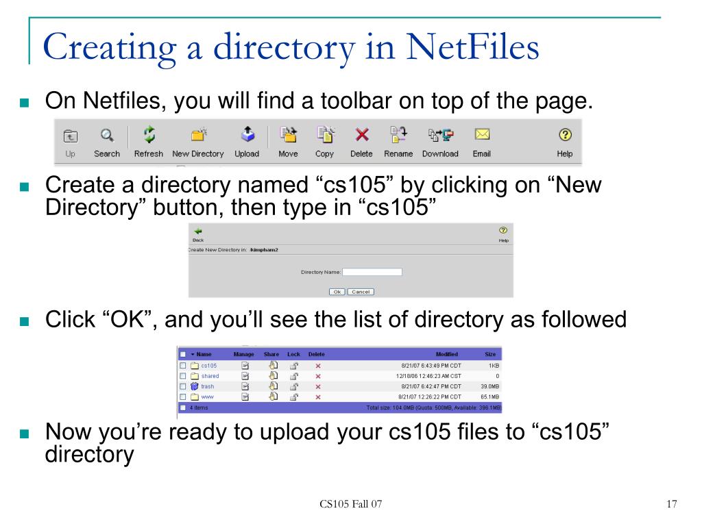 Creating a directory in NetFiles • On Netfiles, you will find a toolbar on top of the page. • Create a directory named “cs105” by clicking on “New Directory” button, then type in “cs105” • Click “OK”, and you’ll see the list of directory as followed • Now you’re ready to upload your cs105 files to “cs105” directory CS105 Fall 07