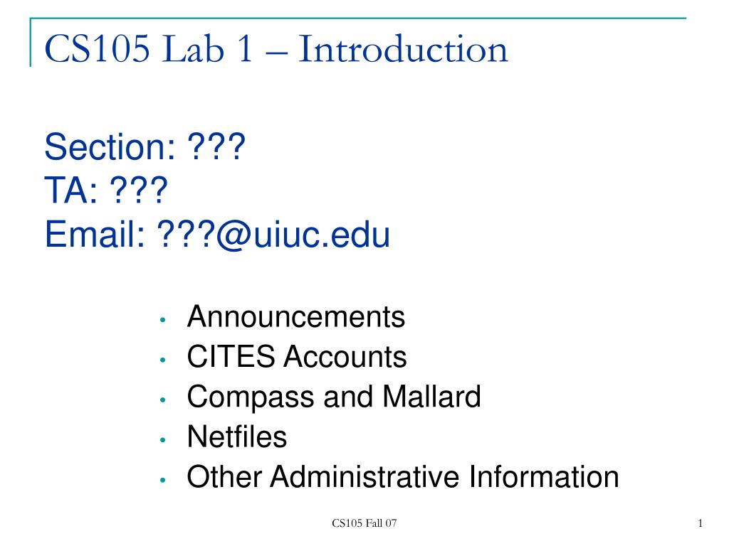 CS105 Lab 1 – IntroductionSection: ??? TA: ???Email: ???@uiuc.edu • Announcements • CITES Accounts • Compass and Mallard • Netfiles • Other Administrative Information CS105 Fall 07