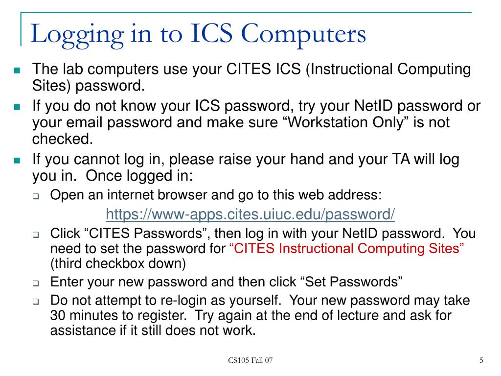 Logging in to ICS Computers • The lab computers use your CITES ICS (Instructional Computing Sites) password. • If you do not know your ICS password, try your NetID password or your email password and make sure “Workstation Only” is not checked. • If you cannot log in, please raise your hand and your TA will log you in. Once logged in: • Open an internet browser and go to this web address: https://www-apps.cites.uiuc.edu/password/ • Click “CITES Passwords”, then log in with your NetID password. You need to set the password for “CITES Instructional Computing Sites” (third checkbox down) • Enter your new password and then click “Set Passwords” • Do not attempt to re-login as yourself. Your new password may take 30 minutes to register. Try again at the end of lecture and ask for assistance if it still does not work. CS105 Fall 07