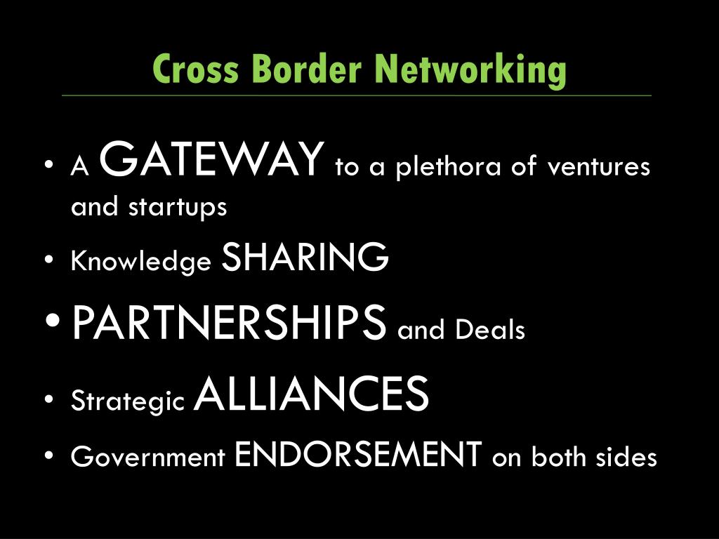 Cross Border Networking • A GATEWAY to a plethora of ventures and startups • Knowledge SHARING • PARTNERSHIPS and Deals • Strategic ALLIANCES • Government ENDORSEMENT on both sides