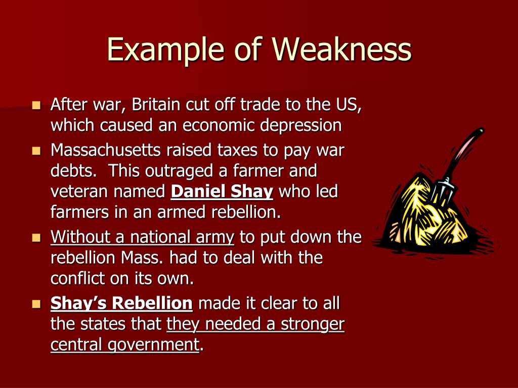 Example of Weakness • After war, Britain cut off trade to the US, which caused an economic depression • Massachusetts raised taxes to pay war debts. This outraged a farmer and veteran named Daniel Shay who led farmers in an armed rebellion. • Without a national army to put down the rebellion Mass. had to deal with the conflict on its own. • Shay’s Rebellion made it clear to all the states that they needed a stronger central government.
