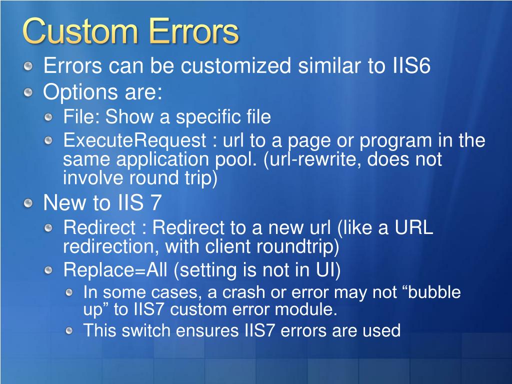 Custom Errors • Errors can be customized similar to IIS6 • Options are: • File: Show a specific file • ExecuteRequest : url to a page or program in the same application pool. (url-rewrite, does not involve round trip) • New to IIS 7 • Redirect : Redirect to a new url (like a URL redirection, with client roundtrip) • Replace=All (setting is not in UI) • In some cases, a crash or error may not “bubble up” to IIS7 custom error module. • This switch ensures IIS7 errors are used