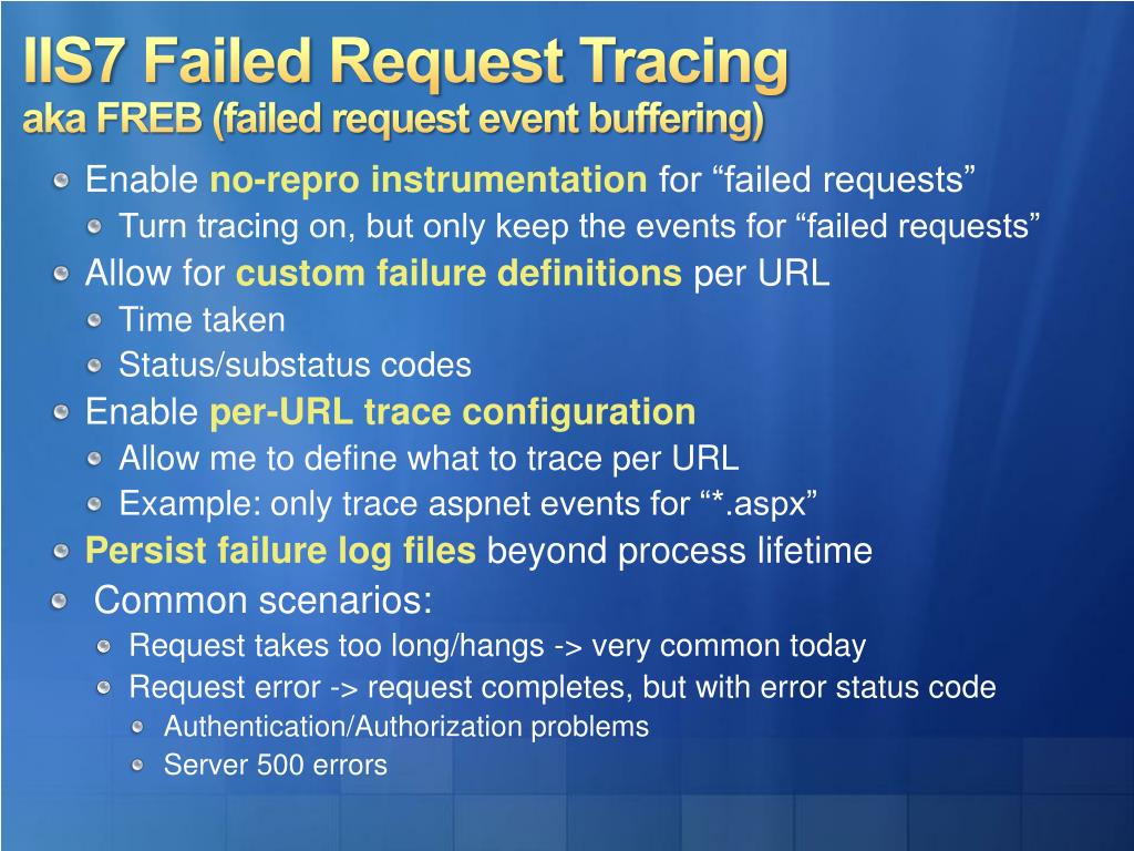 IIS7 Failed Request Tracingaka FREB (failed request event buffering) • Enable no-repro instrumentation for “failed requests” • Turn tracing on, but only keep the events for “failed requests” • Allow for custom failure definitions per URL • Time taken • Status/substatus codes • Enable per-URL trace configuration • Allow me to define what to trace per URL • Example: only trace aspnet events for “*.aspx” • Persist failure log files beyond process lifetime • Common scenarios: • Request takes too long/hangs -> very common today • Request error -> request completes, but with error status code • Authentication/Authorization problems • Server 500 errors